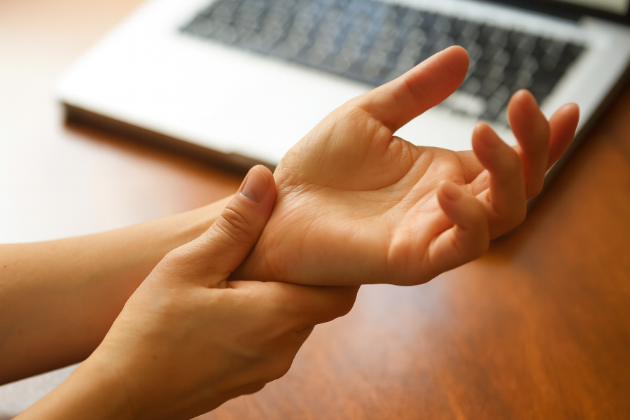 たとえば、パソコン操作で手首を反らせた状態が長く続くと、正中神経への負担が増え、しびれを感じやすくなると言われています(引用元:リハサクマガジン)。