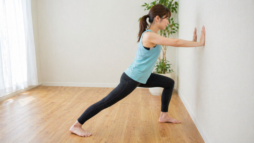 壁に手をつき、片足を後ろに引いてふくらはぎを伸ばすストレッチです。かかとを床につけたまま体を前に倒すことで、ふくらはぎの筋肉がゆっくり伸びると言われています。