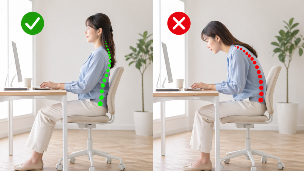 肩の負担を減らすうえで、まず意識したいのが姿勢です。