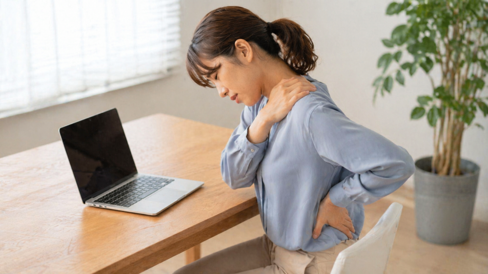 長時間同じ姿勢が続くと、肩や背中の筋肉があまり動かない状態になります。筋肉を動かす機会が少ないと、体の巡りが滞ったように感じる方もいるようです。