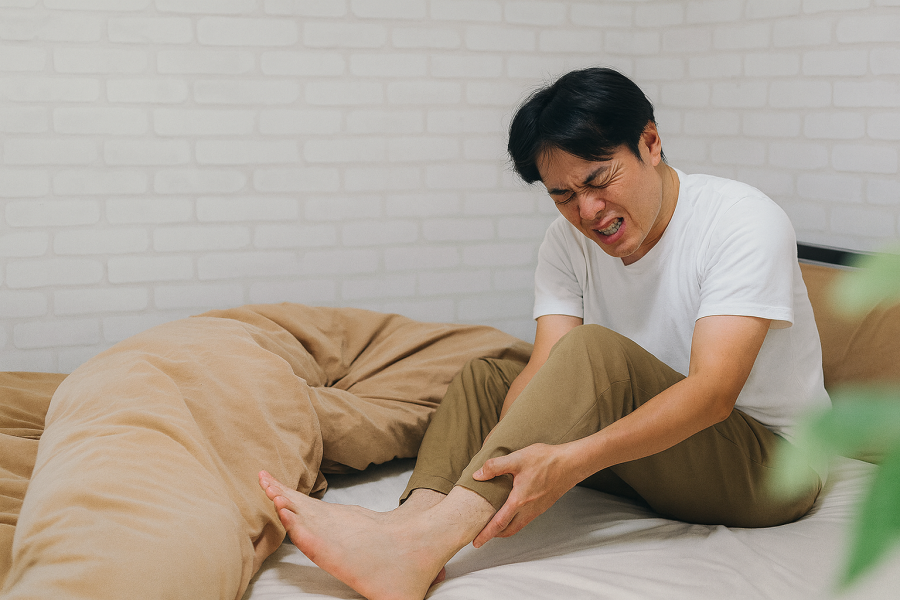 足がつるのは「就寝中」「運動中」「立ち仕事のあと」「冷えた夜」など、特定のシーンで起こることが多いです。