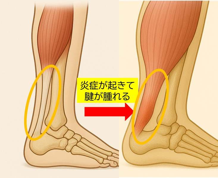 炎症が長く続くと、アキレス腱の組織が変化し、いわゆる“瘢痕化(はんこんか)”が起こる可能性があると言われています。これは、修復された部分が元の状態とは違う硬さや質になる現象です。